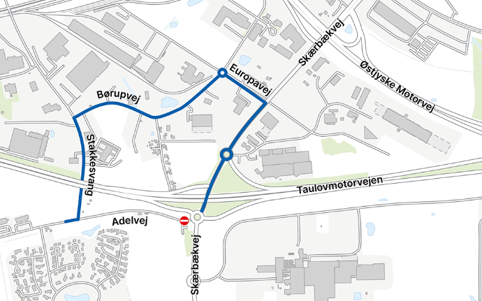 Adelvejs tilslutning i rundkørslen på Skærbækvej skal flyttes, så der fremadrettet er ind- og udkørsel overfor Dronningens Kvarter. Derfor skal der arbejdes på Adelvej, hvilket gør det nødvendigt at lukke for ind- og udkørsel i denne periode.