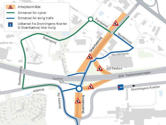 Det vil sige, at Skærbækvej mellem motorvejen og Dronningens Kvarter er spærret frem til maj med omkørsel via den nye Adelvej og den midlertidige tilslutning til rundkørslen, der sikrer adgang fra motorvejen mod syd.