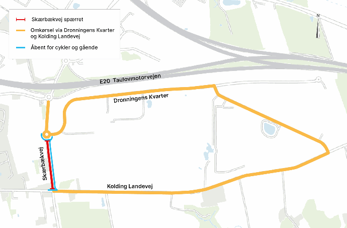 Derfor spærres Skærbækvej mellem Kolding Landevej og Dronningens Kvarter. Det bliver muligt at komme nordfra motorvejen og køre ind og ud ad Dronningens Kvarter. Der etableres omkørsel via Kolding Landevej og Dronningens kvarter, og omkørslen vil blive skiltet i området.