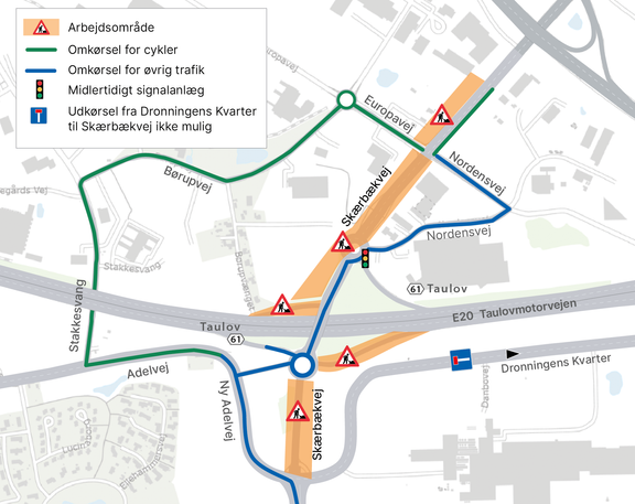 Skærbækvej mellem motorvejen og Dronningens Kvarter er således fortsat spærret frem til maj med omkørsel via den nye Adelvej og den midlertidige tilslutning til rundkørslen.
